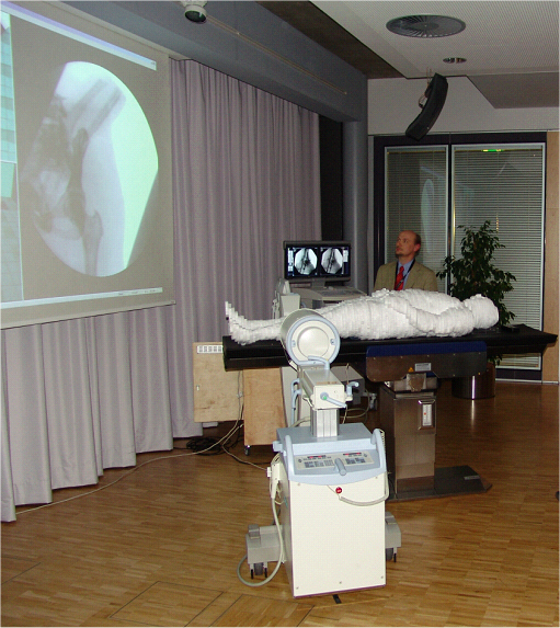 Zusätzlich zur rein virtuellen Simulation ist deren Verknüpfung mit einem realen C-Bogen möglich (siehe Abbildung 4 [Abb. 4]). Durch entsprechende Positionierung des Empfängers eines elektromagnetischen Tracking-Systems auf der Röntgenquelle des C-Bogens und des Senders auf einem OP-Tisch in fester Beziehung zu einem Patienten-Dummy (z.B. einer Styropor-Puppe) sind Position und Orientierung des realen C-Bogens in Bezug auf den Patienten-Dummy festzustellen. Durch Registrierung des virtuellen Patienten mit dem Patienten-Dummy kann so die Bewegung des C-Bogens auf die virtuelle OP-Umgebung umgerechnet werden. Erzeugt der Trainierende nach Einstellung des realen C-Bogens mit virtX ein Einzelbild oder aktiviert er den Durchleuchtungsmodus simuliert virtX die Röntgenbilderstellung mit dem realen C-Bogen. Auf diese Weise entstehen zwei Trainingsmodi: ein rein virtueller Modus (V-Mode), der ohne einen realen C-Bogen auskommt, und ein kombiniert virtuell-realer Modus (V/R).