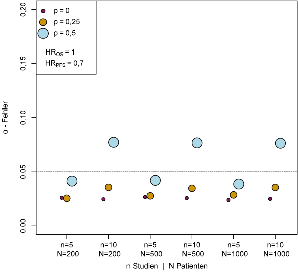 In einer abschließenden Simulation untersuchen wir, wie groß der α-Fehler ist, wenn statt der oberen Konfidenzintervallgrenze des HRPFS nur der Punktschätzer mit dem STE verglichen wird. Mit anderen Worten wird die Fehlerwahrscheinlichkeit je Szenario angegeben, mit der aus dem vorliegenden Effekt des PFS auf einen Effekt des OS geschlossen wird, obwohl letzterer nicht vorliegt. Für den Erwartungswert des HRPFS wird 0,7 gewählt, der Erwartungswert des HROS wird auf 1 gesetzt, es gibt also einen Effekt der Intervention auf das PFS nicht aber auf das OS. Variiert werden wieder die Patientenzahl N pro Studie (200, 500 und 1.000), die Anzahl der Studien n (5 und 10) sowie die wahre Korrelation ρ (0; 0,25; 0,5). Parameterkonstellationen mit höheren Werten von ρ sind zwar mathematisch gesehen möglich, in der Realität allerdings völlig unplausibel. Inhaltlich entspräche das einem starken Zusammenhang zwischen den beiden Hazard Ratios bei gleichzeitig großer Effektivität der Behandlung hinsichtlich des PFS und völligem Fehlen eines Effekts auf das OS.