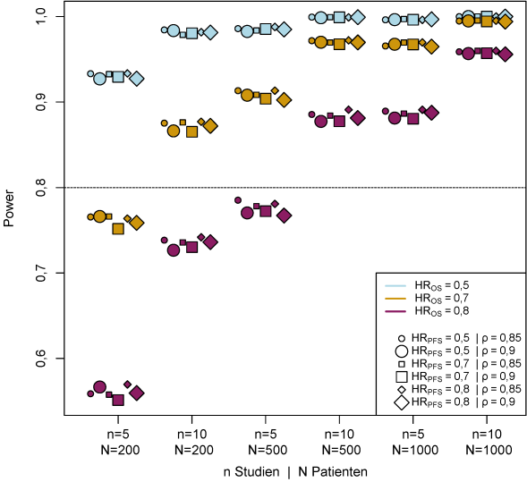 Die Ergebnisse der Power aller Szenarien aus der Simulation zur Anwendung des STE-Konzepts sind in Abbildung 4 [Abb. 4] veranschaulicht. Der Großteil der Szenarien zeigt dabei niedrige Power: nur bei 21 der 108 Szenarien liegt die Power über 80%. Unter diesen 21 befinden sich 18 Szenarien, bei denen der Erwartungswert des HROS bei 0,5 liegt, 15 Szenarien bei denen die Studienanzahl bei n=10 liegt, und 15 Szenarien bei denen die Patientenanzahl bei N=1.000 liegt. Szenarien, in denen der Erwartungswert des HROS mit 0,8 angenommen wird, erreichen maximal eine Power von 47%. Es müsste demzufolge ein extrem starker Behandlungseffekt zum OS (HROS≈0,5) in den für die Validierung herangezogenen Studien vorliegen, um anhand der Ergebnisse des Surrogatendpunkts PFS aus der „pU-Studie“ noch Schlussfolgerungen auf das OS ziehen zu können.