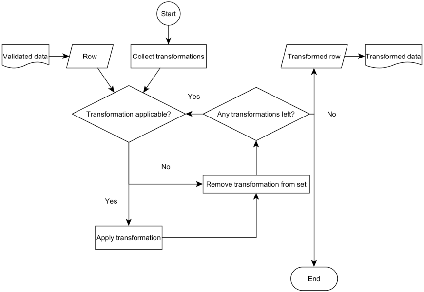 The transformation also defines its applicability to the given row. If it is applicable, the transformation step executes the transformation for the given row and removes it from the set of available transformations. If it is not applicable, the transformation step also removes it from the set and continues with the next transformation as long as transformations still exist in the set. In this way, the validated data changes gradually, but systematically with each applied transformation so that the revised rows are available at the end of the transformation. The program can then assemble the revised rows using the original files or the assigned tables, so that the mediator may inform the HICs about changes to their original data and send the evaluator the data of all HICs. The implemented transformations include, for example, the replacement of insured and internal case numbers, both of which implement a procedure for generating unique numbers from a finite set.