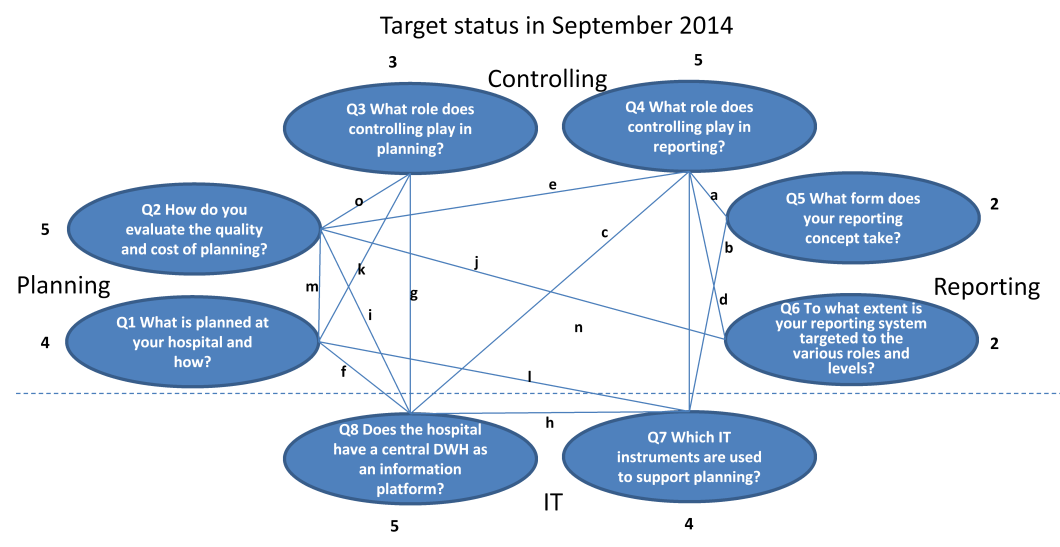 A maturity framework for the evaluation of performance management adjusted to the circumstances of Swiss hospitals formed the basis for an empirical investigation to be performed at these hospitals. Various response categories were defined for between 3 and 5 development levels and these could be selected by the respondents. The survey comprised a total of eight questions about the four functions of planning, controlling, reporting and IT (two questions per function). In addition, survey participants were requested to indicate both the current status (autumn 2012) and the two-year target status (autumn 2014) of developments.