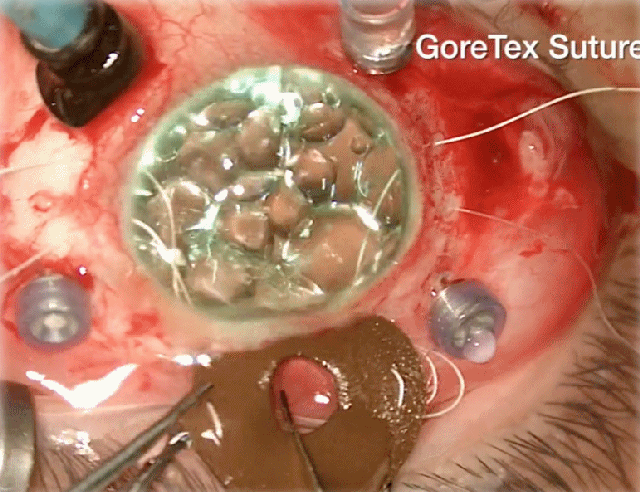 The Akreos® IOL-ArtificialIris complex was fixed and centered to que sclera, using two equidistant 7-0 CV-8 Gore-Tex® sutures. The sutures were trimmed, rotated, and buried, only covered by conjunctiva.