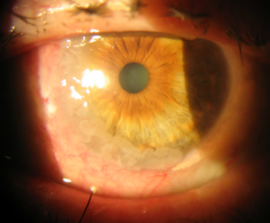 Figure 1: Slit-lamp examination; nasal limbal gelatinous mass with inferior corneal infiltration