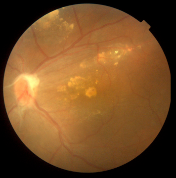 Figure 3: Subretinal old refractile exudation at macula was seen as well as premacular and optic disc fibrous proliferation with macular dragging.