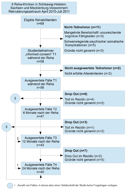 Bei insgesamt 69 positiv gescreenten Patienten kam es in 11 Fällen zu einer Nicht-Teilnahme. Als Gründe hierfür wurden von Seiten der Patienten bzw. der betreuenden Ärzte schwerwiegende somatische bzw. psychische Komplikationen (fünf Fälle), sowie eine mangelnde Bereitschaft zur Studienteilnahme bzw. unzureichende kognitive Fähigkeiten (drei Fälle) angegeben. In drei Fällen wurden keine Gründe genannt. Zwei weitere initial positiv gescreente Patienten mussten aufgrund nicht erfüllter Einschlusskriterien (Überschreiten der Altersgrenze) nachträglich ausgeschlossen werden. Insgesamt konnten somit 56 Rehabilitanden in die Auswertung aufgenommen werden (Abbildung 1 [Abb. 1]).