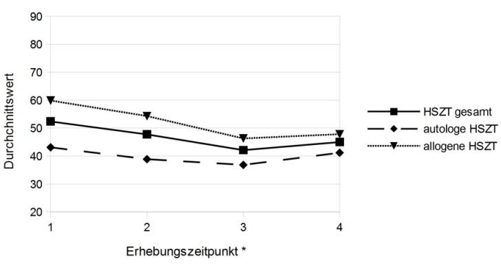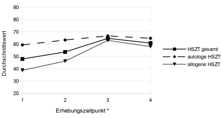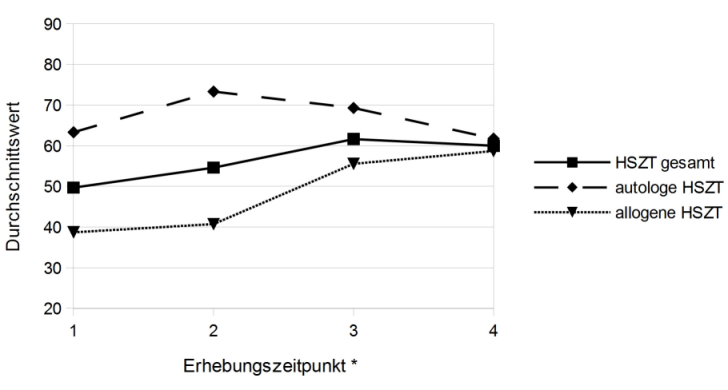In der vorliegenden Studie zeigte sich, dass sich die Rückgewinnung wesentlicher physischer und sozialer Funktionen nach allogener Transplantation über einen wesentlich längeren Zeitraum erstreckte. Während autolog transplantierte Rehabilitanden den Hauptteil des Rückgewinns in Bezug auf das körperliche Funktionsniveau bzw. die Rollenfunktion innerhalb weniger Monate erzielten, erfolgte dies bei allogen transplantierten Patienten – ausgehend von einem schlechteren Ausgangszustand – erst nach Ablauf eines Jahres. Unter Berücksichtigung der Tatsache, dass diese Patienten die Rehabilitation in der Regel erst verzögert antraten, ließ dies auf eine zum Teil über mehr als zwei Jahre nach der Stammzelltransplantation andauernde Regenerationsphase schließen. Diese Ergebnisse stehen im Einklang mit Literaturergebnissen, die nach autologer Transplantation eine in der Regel nach drei bis sechs Monaten abgeschlossene Funktionsrückgewinnung beschreiben, wohingegen für allogen Transplantierte ein Regenerationszeitraum zwischen ein und vier Jahren ermittelt wurde [2], [5], [6]. In Übereinstimmung hiermit erreichten die initial nach allogener Transplantation wesentlich ausgeprägteren Teilhabeeinschränkungen erst nach Ablauf eines Jahres eine weitgehende Rückbildung. Hinsichtlich psychischer Komplikationen zeigte die Längsschnitt-Analyse, dass der Prozentsatz derjenigen Patienten mit auffälligem HADS-Score nach einer initialen Abnahme im weiteren Verlauf auf den Ausgangswert anstieg. Es muss an dieser Stelle offen bleiben, ob die Korrelation auffälliger Ergebnisse des HADS mit einer nicht wiedererlangten Erwerbsfähigkeit durch eine ungünstige psychische Konstellation bedingt wird oder ob sich eine mangelnde berufliche Reintegration ungünstig auf die psychische Verfassung auswirkt.