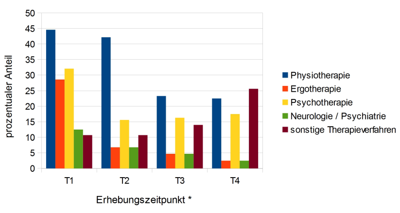 Das tatsächlich von den Patienten in Anspruch genommene Beratungsangebot wurde sowohl quantitativ im Zeitverlauf als auch inhaltlich evaluiert. Zu jedem Erhebungszeitpunkt (T1–T4) wurden die empfohlenen bzw. durchgeführten Begleitbehandlungen (Physiotherapie, Ergotherapie, Psychotherapie, Neurologie-Psychiatrie, sonstige) erfasst, wobei initial zusätzlich eine Nutzenbewertung durch die Patienten erfolgte.