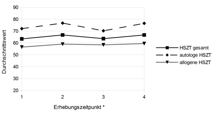 Die Auswertung erfolgte deskriptiv und hypothesengenerierend und berücksichtigte die unterschiedliche Situation autolog (25 Patienten) bzw. allogen (31 Patienten) transplantierter Patienten durch Subgruppenanalysen. Die Auswertungen der Daten erfolgten mit SPSS (Version 20). Für die Subgruppenvergleiche wurden – je nach Datenniveau – Chi-Quadrat-Tests, t-Tests und einfaktorielle Varianzanalysen (ANOVA) gerechnet. Die Zusammenhänge zwischen den unterschiedlichen Skalen wurden korrelationsstatistisch geprüft (Pearson Korrelationskoeffizient). Ergebnisse wurden als statistisch signifikant gewertet, wenn die zweiseitige Irrtumswahrscheinlichkeit kleiner als 5% war.