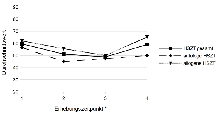 In der vorliegenden Studie zeigte sich, dass sich die Rückgewinnung wesentlicher physischer und sozialer Funktionen nach allogener Transplantation über einen wesentlich längeren Zeitraum erstreckte. Während autolog transplantierte Rehabilitanden den Hauptteil des Rückgewinns in Bezug auf das körperliche Funktionsniveau bzw. die Rollenfunktion innerhalb weniger Monate erzielten, erfolgte dies bei allogen transplantierten Patienten – ausgehend von einem schlechteren Ausgangszustand – erst nach Ablauf eines Jahres. Unter Berücksichtigung der Tatsache, dass diese Patienten die Rehabilitation in der Regel erst verzögert antraten, ließ dies auf eine zum Teil über mehr als zwei Jahre nach der Stammzelltransplantation andauernde Regenerationsphase schließen. Diese Ergebnisse stehen im Einklang mit Literaturergebnissen, die nach autologer Transplantation eine in der Regel nach drei bis sechs Monaten abgeschlossene Funktionsrückgewinnung beschreiben, wohingegen für allogen Transplantierte ein Regenerationszeitraum zwischen ein und vier Jahren ermittelt wurde [2], [5], [6]. In Übereinstimmung hiermit erreichten die initial nach allogener Transplantation wesentlich ausgeprägteren Teilhabeeinschränkungen erst nach Ablauf eines Jahres eine weitgehende Rückbildung. Hinsichtlich psychischer Komplikationen zeigte die Längsschnitt-Analyse, dass der Prozentsatz derjenigen Patienten mit auffälligem HADS-Score nach einer initialen Abnahme im weiteren Verlauf auf den Ausgangswert anstieg. Es muss an dieser Stelle offen bleiben, ob die Korrelation auffälliger Ergebnisse des HADS mit einer nicht wiedererlangten Erwerbsfähigkeit durch eine ungünstige psychische Konstellation bedingt wird oder ob sich eine mangelnde berufliche Reintegration ungünstig auf die psychische Verfassung auswirkt.