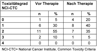 In der Zeit von 07/2007 bis 08/2008 wurden 20 Patienten, 15 Frauen (75%) und 5 Männer (25%), mit einer CIPN eingeschlossen. Alle Patienten erhielten eine potentiell neurotoxische Chemotherapie (Tabelle 1 [Tab. 1]). Das mediane Alter des Gesamtkollektives betrug 59 Jahre (Range: 42–73 Jahre). Im Median erhielten die Patienten 6 Chemotherapiezyklen (Range: 4–12 Zyklen) und der mediane Zeitraum zwischen der letzten Chemotherapie und dem Beginn der Studienbehandlung lag bei 85 Tagen (Range: 3–385 Tage). Die Studientherapie pro Patient dauerte im Median 18,5 Tage (Range: 10–28 Tage) und 18 Patienten (90%) erhielten die Studientherapie an den Händen und den Füßen. Die Mehrzahl der Patienten litt an einer Neuropathie Grad 1–2. Eine Neuropathie Grad 4 fand sich bei keinem Patienten (Tabelle 1 [Tab. 1]).