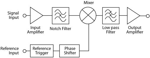 In der Experimentalphysik werden zur Darstellung kleiner sinusförmiger Signale bekannter Frequenz im Rauschen traditionell Lock-in Verstärker benutzt. Abbildung 1 [Abb. 1] zeigt das Funktionsprinzip eines solchen Lock-in Verstärkers. Das verrauschte Nutzsignal wird verstärkt und durch eine Bandsperre von Signalanteilen, die synchron zur Netzfrequenz sind, befreit. Danach wird es in einem Mischer mit einem Referenzsignal der bekannten Frequenz multipliziert, wobei die Phase des Referenzsignals zuvor mit dem Nutzsignal synchronisiert werden kann. Ein Tiefpass integriert das Mischsignal und eliminiert dabei alle nicht zur Nutzfrequenz synchronen Rauschanteile, so dass am Ausgang des Lock-in Verstärkers eine dem Nutzsignal proportionale Gleichspannung anliegt [4].