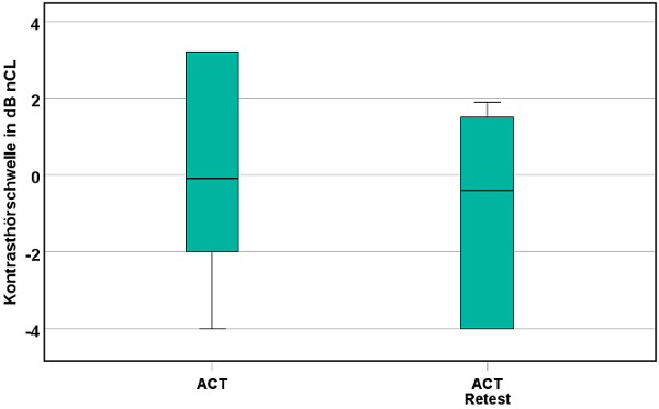 Abbildung 1 [Abb. 1] zeigt die Ergebnisse des ACT-Tests, angegeben als normalisierte Kontrastschwelle (normalised Contrast Level, nCL). Der Wertebereich des Tests ist von –4 bis 16 dB nCL definiert. Für junge, normalhörende Erwachsene wird im Median eine normalisierte Kontrastschwelle von 0 dB nCL erwartet; positive Werte deuten auf einen Kontrastverlust [12]. In der hier vorgestellten Pilotstudie liegt der Median im Test bei –0,1 dB nCL und bei –0,4 dB nCL im Retest. Test- und Retest-Ergebnisse korrelieren mit r=0,898.