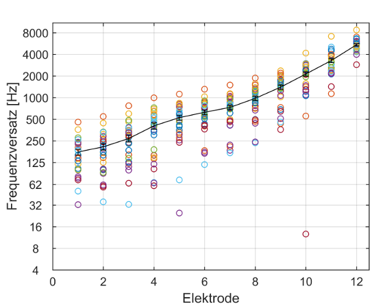 Cochlea-Implantate (CI) sind heute das Mittel der Wahl, um bei ertaubten oder hochgradig schwerhörigen Patienten die Hörfunktion in Teilen wiederherzustellen. Durch den in die Cochlea eingebrachten Elektrodenträger können Spiralganglienneurone elektrisch stimuliert werden. Der von den Reizelektroden überspannte Stimulationsbereich hängt stark von der Elektrodenlänge, Elektrodenbauform und den individuellen anatomischen Verhältnissen der Cochlea ab. Die Verteilung der den einzelnen Elektroden zugeordneten Bandpassfilterfrequenzen zeigt im Vergleich zur regulären Verteilung der Elektrodenposition-Frequenzzuordnung (Ep-Fz) auf der Basilarmembran einen Frequenzversatz (FV), der von der erreichten Insertionstiefe des Elektrodenträgers abhängt.