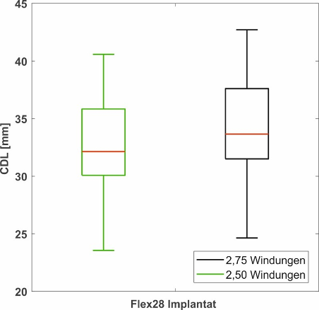 Die Annahme einer gegenüber den Standard-Modellvorstellungen um ein Viertel vergrößerten Anzahl der Windungen der Cochlea zeigte keinen signifkanten Einfluss auf die Schätzung der CDL für die hier betrachtete Patientengruppe mit N=32. Die mit dem ESC-Modell abgeschätzte mittlere CDL lag bei 32,14 mm. Dieser Wert ist in guter Übereinstimmung mit den von Hardy [6] vorgestellten Ergebnissen (CDL dort 31,52 mm). Eine aktuellere Meta-Analyse (Koch et al. [7]) ermittelte CDL-Werte zwischen 30,76 mm und 37,41 mm.