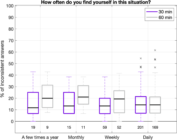 RQ3: In the field trial, investigations of the relationship between situation and occurrence to remember the situation yielded mixed results. The type of situation itself had an impact on the inconsistency of answers (F(6,512)=12.69, p<0.001), but no significant relation was found when considering the interaction with the delay (F(6,512)=1.173, p=0.319). While it appears that the occurrence of situation may impact the ability to accurately recall it (see Figure 2 [Fig. 2]), the ANOVA analysis did not support this finding as the interaction between occurrence and delay was not significant (F(3,518)=2.379, p=0.070). For less frequent situations, the inconsistency of 20.0% for a delay of 60 minutes was reduced to 11.8% by shortening the delay to 30 minutes.