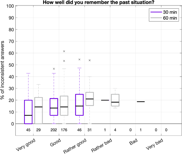 Figure 3: Inconsistency of answers between momentary and retrospective assessments displayed over the self-reported ability to remember the past situation correctly in the field trial with a delay of 30 and 60 minutes. The numbers at the bottom give the number of assessments.