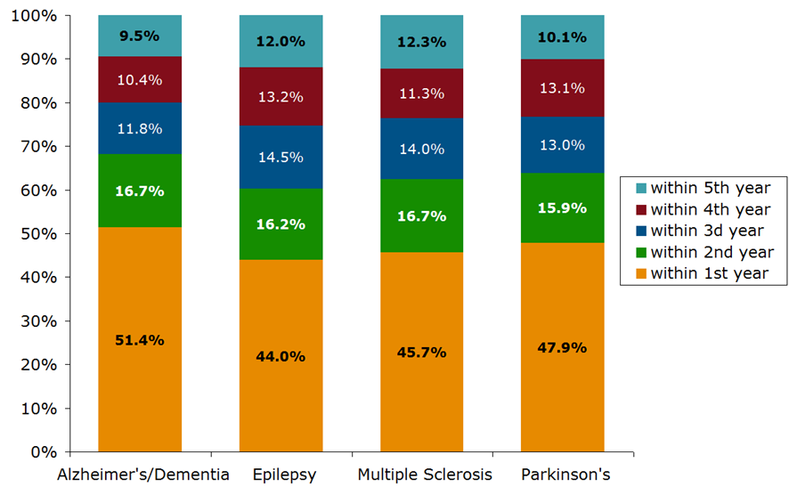Finally, we studied how many depression patients received antidepressant medication. The percentages were 56.6% for epilepsy patients, 63.9% for Alzheimer’s/dementia, 66.8% for Parkinson’s, and 67.0% for multiple sclerosis.
