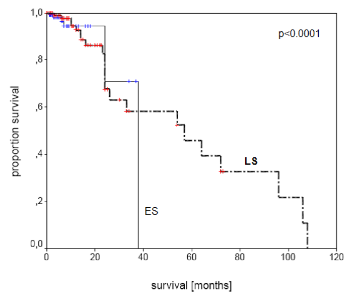 SCCE is a rare tumour ranging between 0.5% up to 2.4% of malignant oesophageal neoplasms [3], [25] and therefore information about the best therapeutic approach is not available. Here we present an individual patients’ data metaanalysis in respect of the reviewed published literature. The disease has been described in patients ranging in age between 28–88 years, but most commonly it occurs during the sixth to eighth decades of life [26]. This matches to our median age of 60 years. Age <50 years was associated with a statistically significant better overall survival at the time of diagnosis, but only 10.2% of the patients were younger than 50 years. The reason for this observation may be attributed to more aggressive therapy in cases of younger patients. Every patient younger than 50 years received a multimodal therapy with at least two different modalities. The clearest case of this fact were two patients who were treated with chemotherapy and syngeneic bone marrow or an autologous bone marrow transplant followed by radiotherapy. One patient achieved an overall survival of 36 months [27]. The other was disease-free 38 months after transplantation [28]. In a retrospective review of 199 patients, Casas et al. reported a male-to-female ratio of 1.57:1 [22]. Our ratio was slightly higher with a relation of 1.94:1. A study of 21 cases from China even reports a male-to-female ratio of 3.2:1 [29]. The male dominance could reflect the higher incidence of typical risk factors for esophageal cancer in general. Certain risk factors were not exactly specified and other risk factors beside smoking and alcohol, in rare cases also reflux and Barrett syndrome, were not named. So the typical risk factors for a small cell carcinoma of the lung, ergo alcohol and smoking, can be transferred to our case of the esophagus. In contrast to former series described [22], [26], we found a predominance of SCCE in the middle third of the esophagus followed by the localization in the lower third of the esophagus, but the low differences suggest that the tumour can be found in the lower and middle third in the same proportion. In the upper esophagus SCCE is rarely found (<5%). This correlates with the different nature and the type of muscle cells in the upper esophagus in relation to the lower and middle third (skeletal muscles in the upper third, smooth muscles in the middle and lower third). Symptoms present at the time of diagnosis were predominantly dysphagia, followed by weight loss and chest pain. Mean duration of symptoms was 4.1 months. Neither tumour size nor site of the tumour in the esophagus showed statistical differences in terms of different median survival in any group. Due to the small number of patients who have been reported on, the importance of factors such as argyrophilia or the presence of neurosecretory granules has not been evaluated. With regard to the small tumours of the lung, the oesophageal variety behaves aggressively and is associated with rapid and widespread metastases at time of diagnosis, therefore the prognosis for constant healing is worse compared to its counterpart from the lung, but compared to the small cell carcinoma of the lung, a significant survival difference has been observed between LS and ES disease. One reason of bad prognosis for disease at ES could be that most of the patients had either been in very poor condition at the time of diagnosis and thus received no specific antineoplastic therapy, or were treated only with palliative surgery. In none of the articles the performance status of patients was clearly documented, which is an important factor for the beginning of treatment. The provision of treatment in cases of ES or the addition of systemic treatment in cases of LS is also influenced by performance status. Therefore, the performance status is a very important factor in the selection of treatment. Also, due to the small number of patients, evaluation of possible differences in the therapeutic results of different applications of chemotherapy has not been carried out. A lot of options have been exercised in the treatment of SCCE, but it is still not possible to compare the efficiencies because of the small number of patients and the lack of controlled trials. In Japan, a 78-year-old man with SCCE was treated with a carboplatin (CBDCA) plus etoposide (VP-16) combination of chemotherapy and radiation leading to complete remission without recurrence [30]. Another 60-year-old Japanese patient was treated with 5-fluorouracil plus cisplatin (CDDP) and surgery leading to disappearance of the tumor without recurrence [31]. Dealing with extrapulmonary SCC, there is an arising conformance in the literature that chemotherapy should be the basis of treatment. Our review confirms this fact, also because it is verified that small cell carcinoma in general is susceptible to antineoplastic chemotherapy. SCCE is histologically identical to its counterpart from the lung, its aggressive behavior and chemosensitivity are similar [19]. Lack of antineoplastic therapy is associated with a statistically significant shorter survival which is shown in cases where patients received only best supportive care. In any case the practicability of any kind of active treatment is the best prognostic factor. Therefore systemic treatment must be an integral part of treatment in view of the high rate of distant metastasis at diagnosis or later in the course of the disease. Local tumour control also seems to be important. A patient reported by Law et al. survived 72 months after he has been treated by surgery followed by chemotherapy and, after recurrence, by radiotherapy. Radiotherapy alone used on patients with esophageal SCC has shown disappointing results and should rarely be used as the sole treatment modality [32], [33]. In their review of 107 patients [34], Lieberman et al. found out that the longest median survival time (28 months) was obtained in cases of patients treated by esophagectom
