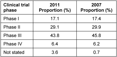 A breakdown by clinical trial phase and therapeutic indication for the 251 evaluated applications is given in Table 1 [Tab. 1] and Table 2 [Tab. 2]. No statistically significant difference (95% CI) was noted with respect to the category of the clinical trial phase (Table 1 [Tab. 1]) when comparing 2011 to 2007. A statistically significant increase in oncology trials from 17.3% (21.9%, 13.5%) in 2007 to 27.1% (32.6%, 22.1%) in 2011 was reported whereas the proportion of studies in all other therapeutic indications changed only slightly (Table 2 [Tab. 2]).