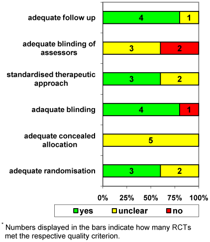 Three RCTs [20], [22], [44] used ITT analysis. The study by West et al. [23] does not specify how data were analysed. Since more than 80% of patients randomised have been analysed, adequate follow-up examination can be assumed. The fifth study [21] does not describe exactly the number of participants analysed.