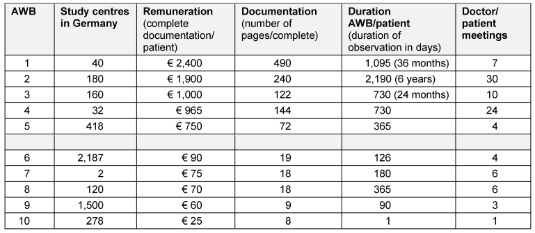The survey recorded AWB with documentation requirements of between 8 and 490 DIN A4 pages per complete patient documentation. This range shows the very different approaches (and the differing level of work required for the doctor/the study centre as a result) between the individual AWB. Accordingly the remuneration was also different; from € 25 in an AWB with a documentation requirement of 8 pages with one doctor/patient contact and € 2,400 in an AWB with 490 pages of complete documentation with seven visits in 36 months. This AWB not only examined the use of the drug but also the resources necessary and the specific costs for the standard therapy (therapies) in the indication examined in Germany. This involved approx. 70 pages of documentation per doctor/patient contact and also contained questionnaires for patients and involved relatives.