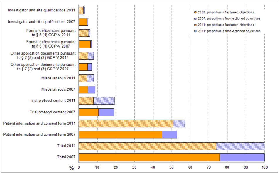 As in 2007, about 1 in 6 applications was still incomplete with formal objections. Whilst the proportion of study applications with objections related to the patient information and consent form (+7.2%), the trial protocol content (+11.6%), and documents according to § 7 (2) and (3) GCP-V (+11.8%) increased in 2011 compared to 2007, the amount of study applications with objections related to the investigator and site qualifications decreased by 6.3%.