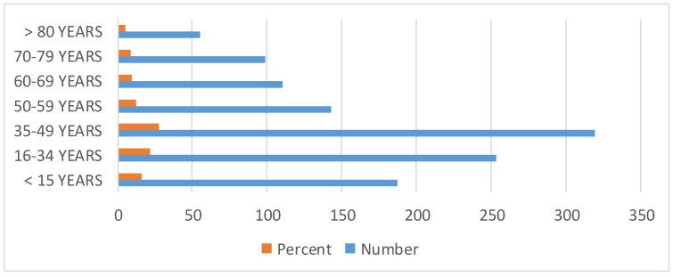 Study group of 1,166 patients consisted of 605 (51.88%) males and 561 females (48.11%). Mean age of onset was 42.8 ± 24 years (range from 0–85). Demographic and clinical data are illustrated in Table 3 [Tab. 3] and in Figure 1 [Fig. 1], Figure 2 [Fig. 2], Figure 3 [Fig. 3], Figure 4 [Fig. 4]. There is no difference in genders. Around 35% of patients are above 50 years of age. Diabetic patients constituted 400 out of 1,166 patients. Poor control of diabetes with mean HbA1c of 8.1±2.11 is found on analysis. 70.33% of diabetic patients had HbA1c >7%. Even though dyslipidemia is found in 70% of patients only 16% patients are taking statins which is alarming (Table 3 [Tab. 3]).