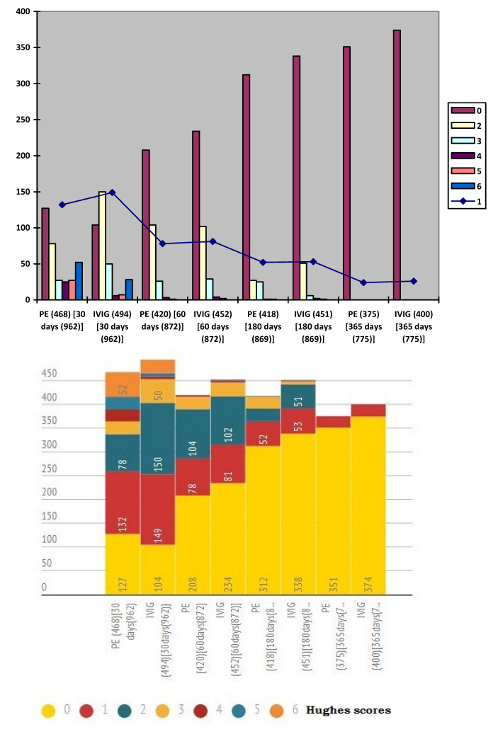 Follow-up of patients with GBS were illustrated in Table 10 [Tab. 10] and Figure 9 [Fig. 9]. At 30 days of follow-up, Hughes grade of 0 was observed in 127 (27.13%) patients of plasma exchange group and 104 (21.05%) patients of IVIG groups. At 180 days of follow-up, Hughes grade of 0 was noted in 312 (74.64%) patients of plasma exchange group and 338 (74.94%) patients of IVIG groups. At 365 days of follow-up, progressive improvement in muscle strength is noted. Hughes grade of 0 was noted in 351 (93.6%) patients of plasma exchange group and 374 (93.5%) patients of IVIG groups at 365 days follow-up. No statistically significant difference in follow-up and outcome at discharge was found at 30, 60, 180 and 365 days between both groups.