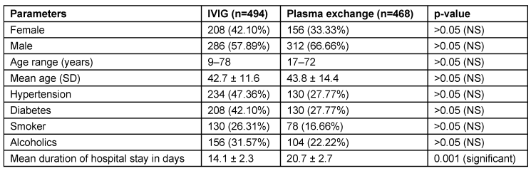 Another significant observation was that most patients in plasma exchange group belonged to the lower socio-economic status as per modified Kuppuswamy’s socio-economic scale used in India [58]. Also statistically significant longer hospital stay was noted in plasma exchange group compared to IVIG group. This may be due to the financial constraints of patients in plasma exchange group which may include delay in getting investigations and treatment. Deaths observed were 24 (4.85%) patients in IVIG group and 20 (4.27%) patients in plasma exchange group, slightly more than in studies reported from Europe and North America [59]. Even though IVIG is comparatively easier to administer and duration of hospital stay is lower compared to plasma exchange, it is more expensive. No difference was noted in the effectiveness of treatment or improvement rate by usage of either treatment.