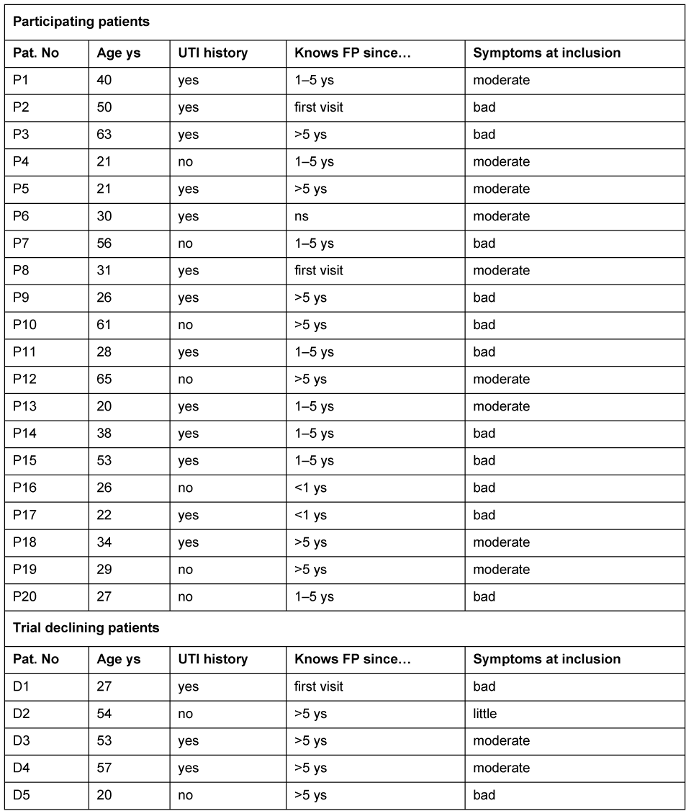 Methods: This study was embedded in a drug trial comparing two treatment strategies for women with uncomplicated urinary tract infection in primary care. Semi-structured telephone interviews both with trial participants and decliners were conducted. The interview guideline focused on patients’ personal motivational or hampering factors. Further topics were study theme, FPs’ role, randomization, trial procedures, and potential motivational factors or barriers presumed to be relevant for other patients. Transcripts were analyzed by summarizing content analysis.