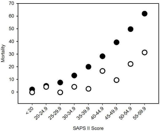 Figure 1: Calculated (dots) and observed (circles) mortality in relation to SAPS-II score