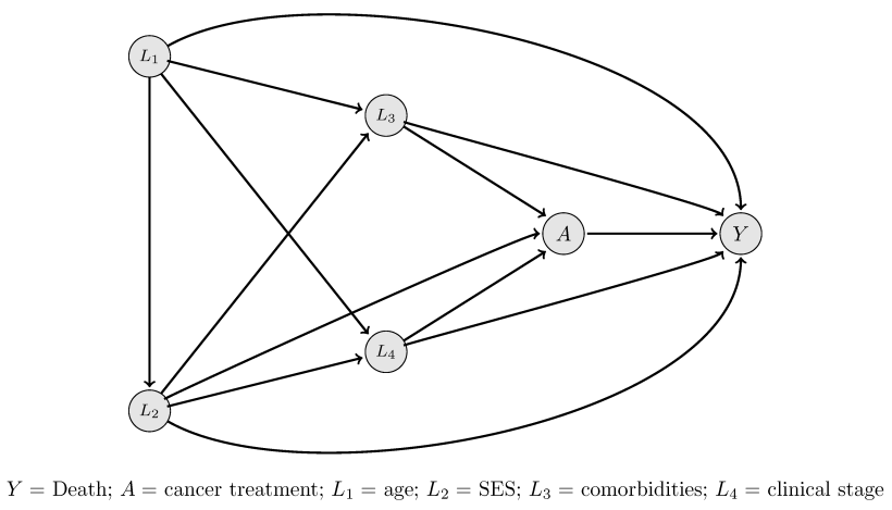 The causal DAG in Figure 2 [Fig. 2] tells us that there are no mediators or colliders that would need to be taken into account when estimating the effect of cancer treatment on mortality. There are, however, various back-door paths that start with arrows into the treatment variable. They can be blocked if the variables of L=(age, socioeconomic status [SES], comorbidities, stage) are included and adjusted for in the analysis.