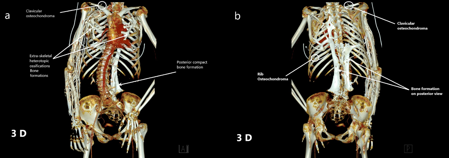 Figure 1: 3D reconstruction images; the extra-skeletal bone formations and heterotopic ossifications around the chest, clavicular osteochondroma in the middle part of right clavicula, compact bone formations along with the vertebral axis