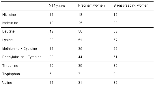 Table 3: Recommended intakes for indispensable amino acids (mg/kg body weight/day, [55])