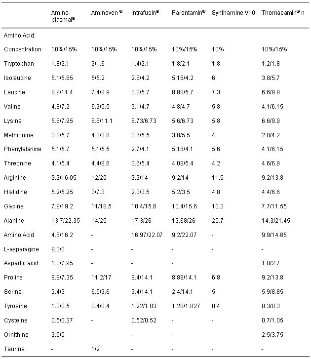 Table 4: Available parenteral amino acid solutions for adults (g/L) (Version 05/2004)