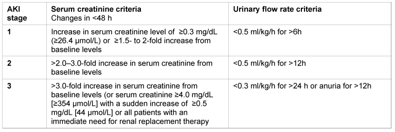 [412] Mehta RL, Kellum JA, Shah SV, Molitoris BA, Ronco C, Warnock DG, Levin A; Acute Kidney Injury Network. Acute Kidney Injury Network: report of an initiative to improve outcomes in acute kidney injury. Crit Care. 2007;11(2):R31. DOI: 10.1186/cc5713