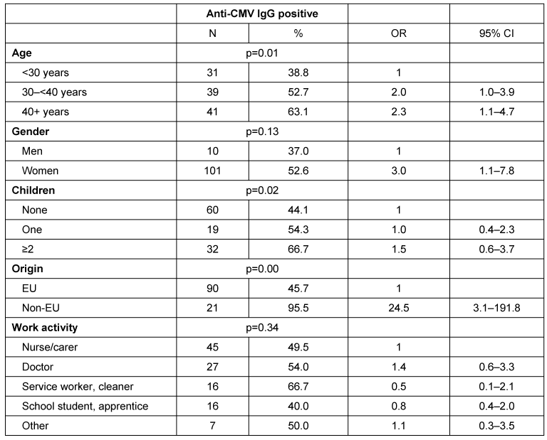 Table 2: Number of persons with positive anti-CMV IgG (N=111) and OR adjusted for age, gender, number of children, origin and work activity