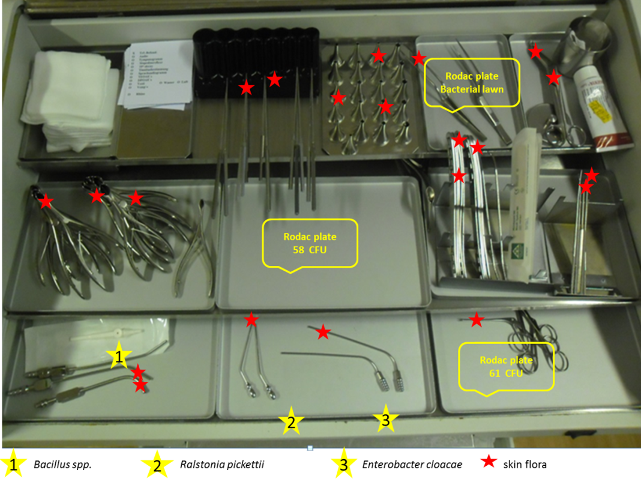 Furthermore, we performed qualitative analysis of the trays and the ENT unit itself. Besides the above mentioned finding of skin flora, we detected aerobic spore-forming bacteria and, in two cases, pathogens. On the workstation, we found Ralstonia picketii and Enterobacter cloacae. The places of detection are displayed in Figure 1 [Fig. 1].