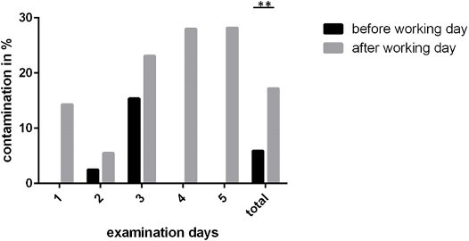 Figure 2: Rate of contaminated instruments before the beginning and at the end of a working day for five consecutive days