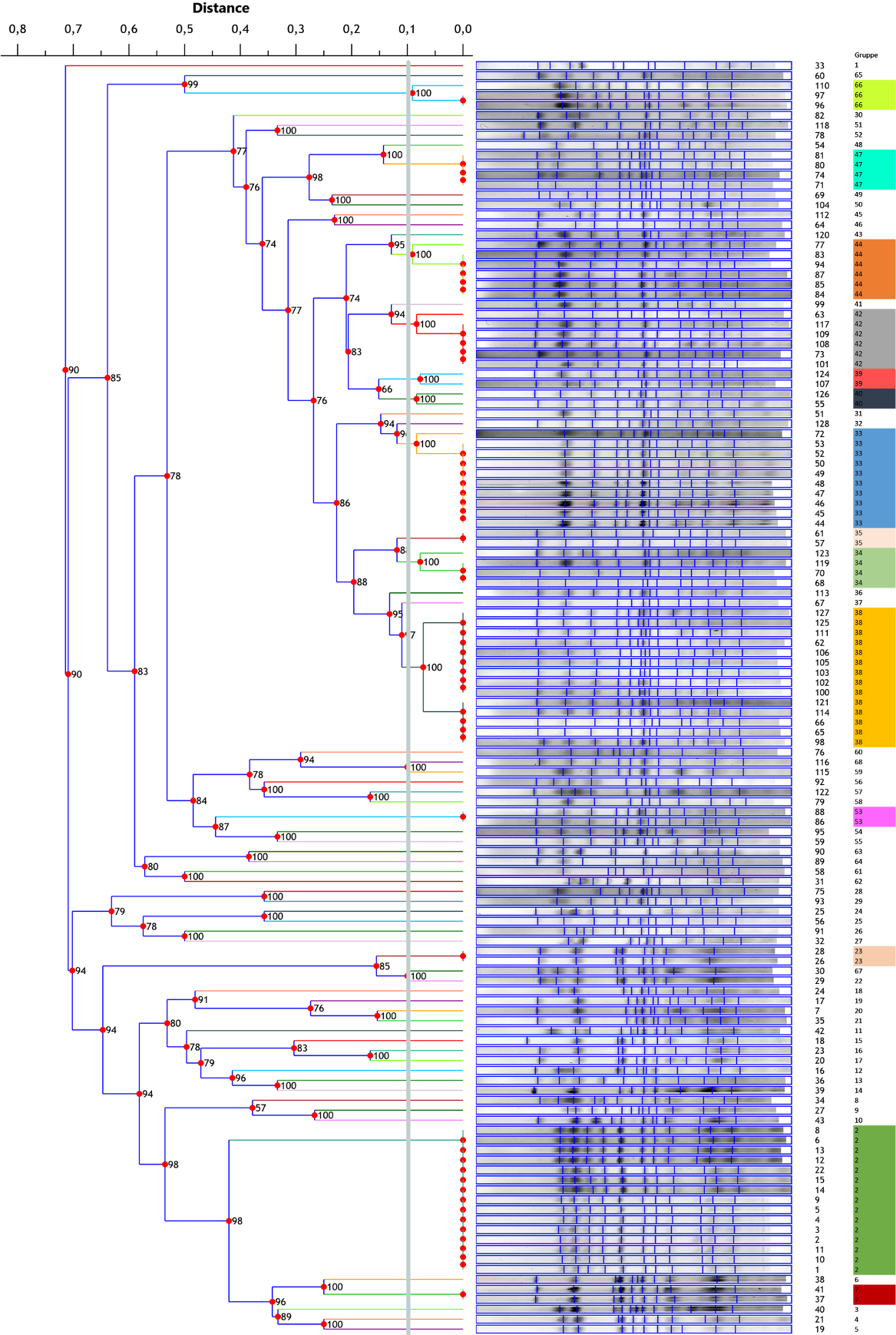 Figure 2: Dendrogram of the 128 isolates after PFGE with SmaI restriction The scale shows the similarity between the isolates. The shorter the distance, the greater the degree of relationship. The branches of the isolates that split on the right side of the grey line at 90% belong to one PFGE type (group).