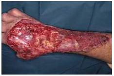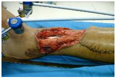Im klinischen Alltag sehen wir die unterschiedlichsten infizierten Problemwunden. In einer unfallchirurgischen Klinik handelt es sich in einem Großteil der Fälle, die eine Lappenplastik benötigen, um kontaminierte Wunden nach Trauma mit ausgedehntem Weichteilverlust und freiliegendem Knochen und Osteosynthesematerial (Abbildung 1 [Abb. 1]).
