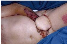 Ein typischer Vertreter der gestielten Fernlappenplastik ist der Leistenlappen. Es handelt sich hierbei um einen random pattern flap, das heißt der Haut-Subkutangewebelappen wird nicht an einem definierten Gefäßstiel gehoben, sondern es verbleibt ein im Verhältnis zur Lappengröße breiter Verbindungsstiel zur Spenderregion, über den die Lappendurchblutung gewährleistet wird. Aus der Wirtsregion sprossen dann Gefäße in den Lappen ein, die sukzessive die Lappenernährung übernehmen, so dass nach etwa 14 Tagen eine Stieldurchtrennung erfolgen kann (Abbildung 29 [Abb. 29], Abbildung 30 [Abb. 30] und Abbildung 31 [Abb. 31]). Bis zur Stieldurchtrennung muss Bettruhe eingehalten werden, um ein Ausreißen des Lappens zu verhindern.