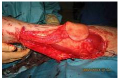 Eine weitere häufige Indikation sehen wir bei Patienten mit Osteomyelitiden, bei denen nach Sanierung der Infektion eine Weichteildeckung bzw. eine Auffüllung des entstandenen Defekts notwendig wird (Abbildung 2 [Abb. 2]).