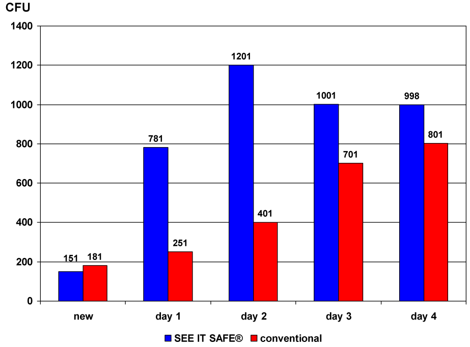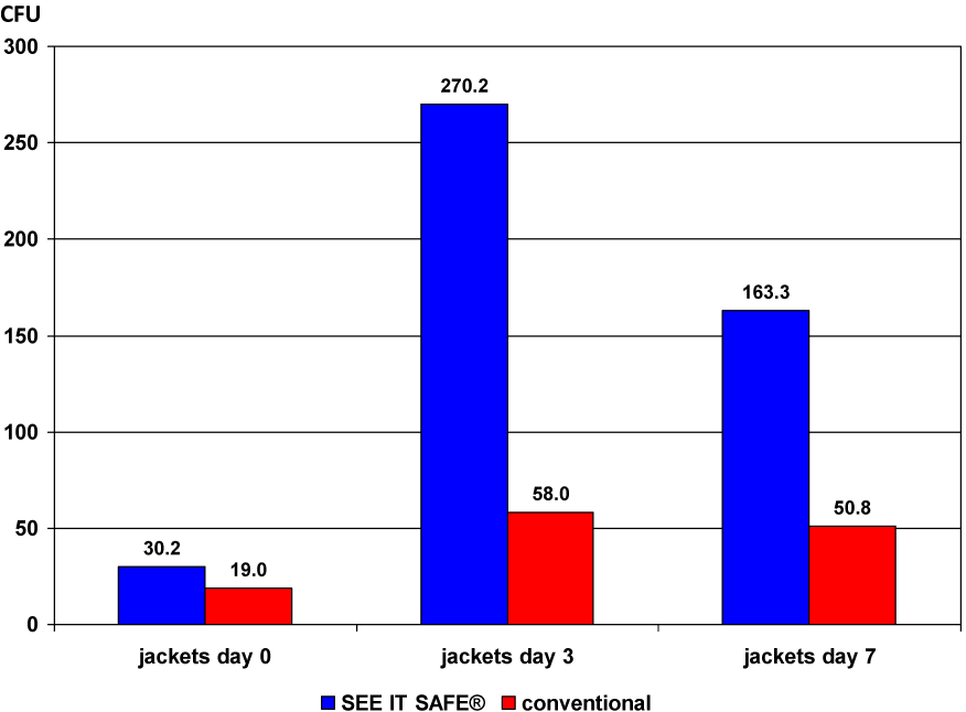 Although for jackets the microbial counts were higher and there was no difference for trousers, fundamentally, there was no hygienic advantage to SEE IT SAFE® clothing. Yet, the obtained results are not entirely surprising. In the analysis of atopic dermatitis patients wearing silver undergarments, we found a reduction of S. aureus of only 0.5 log, and determined a total colony count reduction of 0.4 log during the time of wearing. It should be noted that because of skin transpiration – in contrast to the relatively dry outside of the uniforms (winter without snow) – a better development of the effect of released silver ions is expected. After 2 days of wearing the placebo textile, the inside yielded 385.6±63.5 CFU and 236.5±49.9 CFU S. aureus, and 279.9±78.7 CFU and 119.3±39.4 CFU S. aureus were detectable on the silver textile. By daily washing at 60°C with conventional laundry detergent, contamination in both cases was almost completely eliminated [1].