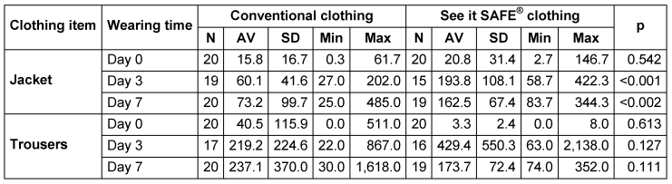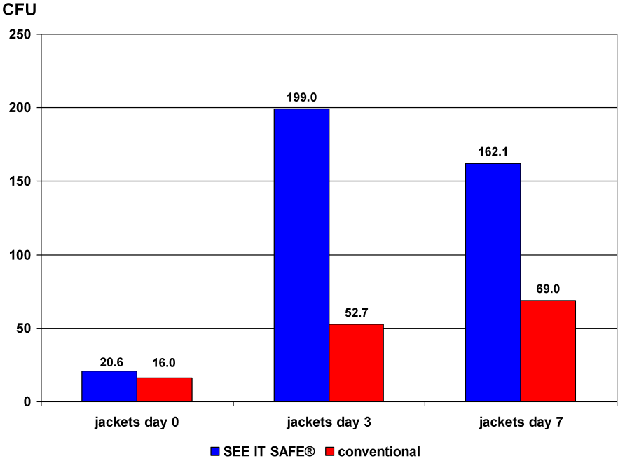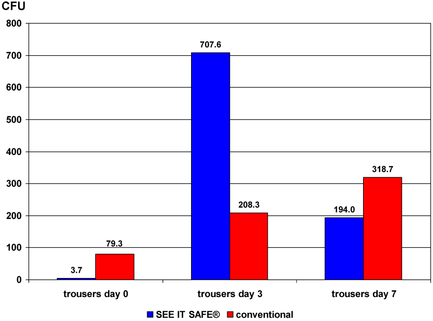 Overall, after concluding both parts of the study, it was shown that the number of CFU on the SEE IT SAFE® jackets, with the exception of day 0, was 3.8 times higher on day 3 and 2.3 times higher on the 7th day compared to conventional clothing (Figure 7 [Fig. 7]). Concerning SEE IT SAFE® trousers, the number of CFU at days 0 and 7 was lower than on conventional clothing. However, after 3 days, the number of CFU on SEE IT SAFE® trousers was nearly twice that on conventional clothing (Figure 8 [Fig. 8]).