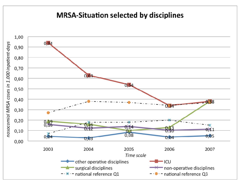 The East German University Hospital Dresden can be seen (regarding all MRSA cases per 1,000 inpatient days) under the 25% percentile between 2004–2007 compared to the national average monitored by the MRSA-KISS study. The hospital acquired MRSA rate per 1,000 MRSA days is comparably high on national comparison. Further data will be necessary to evaluate this.