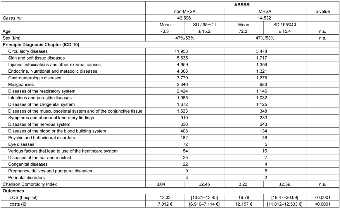 To assess possible savings, a 3:1 propensity score matching was performed. Matched were the infection cases with MRSA infection cases against infections without MRSA from the two groups (ABSSSI and JBPI) using age, sex, principle diagnosis, DRG and comorbidities (via Charlson Comorbidity Index – CCI) in order to control confounders for costs, using a caliper of 0.1. The difference in costs and aLOS were then analysed.