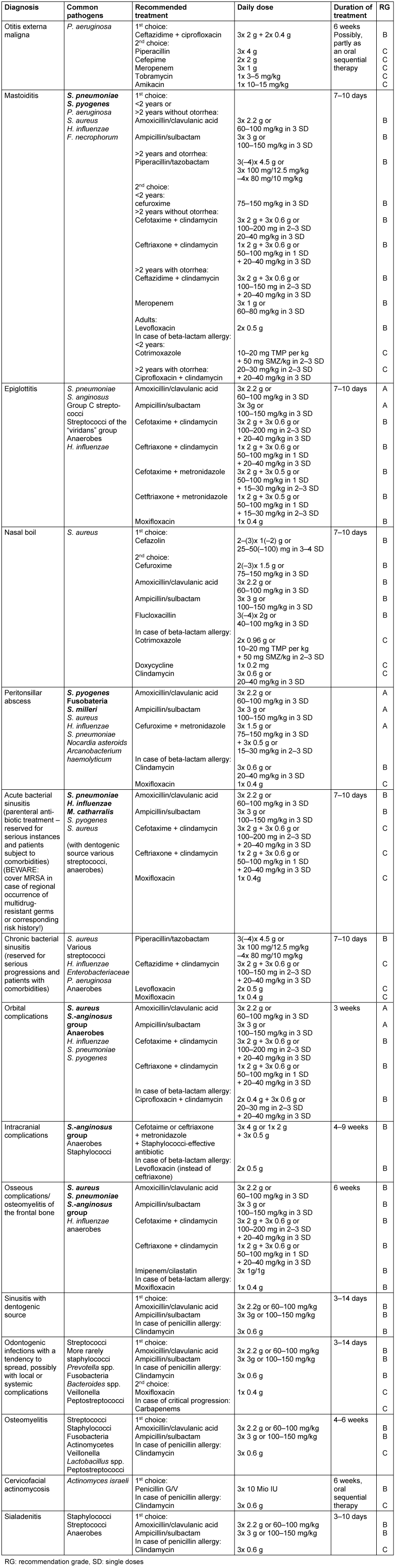 Bacterial infections of the head and neck region often require the use of antibiotics. The decision for parenteral treatment depends on the severity of the infection, possible risk of spread (for example obstruction of the airways), comorbidities and individual application requirements. In some cases, even in severe infections, the good bioavailability of orally administered fluoroquinolones and clindamycin allows oral administration. This should be given preference as much as possible due to the greater ease of administering it. In contrast, initial treatment of mastoiditis, external otitis maligna, sinusitis with orbital or intracranial complications, epiglottitis, severe odontogenic abscess and cervical phlegmon should generally be with a parenteral antibiotic. As a rule, initial treatment must be calculated; however, in these serious diseases a diagnosis of the microbiological pathogen should be the aim. Sequential therapy is usually possible, i.e. oral treatment after clinical improvement.