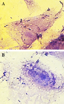 Figure 2: Gentamicin-HEp-2 cell invasion assay. Intracellular localization of S. sonnei (A) and S. flexneri (B) in HEp-2 cell monolayers after 3 hours