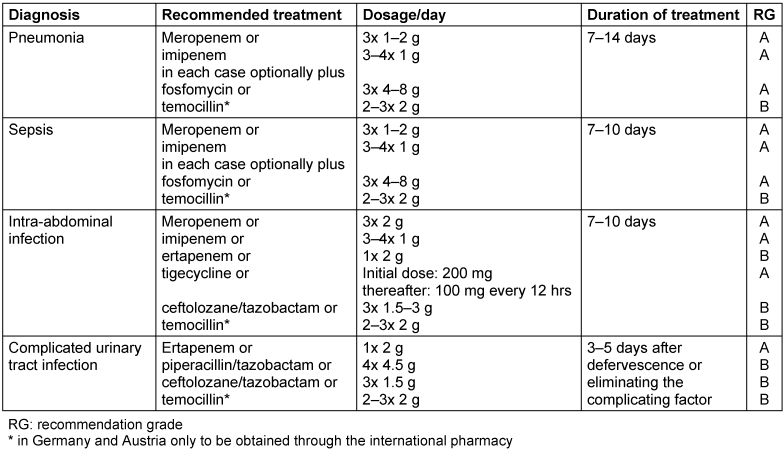 Table 3 [Tab. 3] provides suggestions for the treatment of pneumonia and sepsis by carbapenem-resistant Enterobacteriaceae.